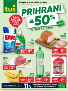 OD SREDE, 21. 1., DO TORKA, 3. 2. 2026, oz. do odprodaje zalog. SENIOR SREDA: pri kateri člani Tuš Senior kluba pridobijo 11 % vrednosti prvega dnevnega nakupa kot D*NAR na Tuš klub kartico. Ugodnost se članom Tuš Senior kluba obračuna samodejno, brez predložitve kupona. Ob nakupu se kuponi in ostale ugodnosti ne obračunajo. Pogoji SENIOR SREDA na www.tus.si. SENIOR SREDA, 21. 1. VREDNOSTI PRVEGA NAKUPA VRNEMO KOT D*NAR NA TUŠ KLUB KARTICO 11% 599 s Tuš klub kartico 11,99 -50% CENEJE DETERGENT FAKS • prašek, Aquamarine ali SuperAktiv, 40 pranj, 2,2 kg • gel, Universal ali Color, 40 pranj, 1,8 l PREKAJENO PLEČE AVE • vakuumsko pakirano • cena za 1 kg SREDA, 21. 1. 2026 NAPOLITANKE NOUGAT • Podravka • 800 g 299 s Tuš klub kartico PC 30: 5,45 5,45 -45% CENEJE SVINJSKO PLEČE BREZ KOSTI • poreklo: EU • postrežno • cena za 1 kg Ponudba velja od 21. 1. do 27. 1. 2026. 349 SUPER CENA BANANE • cena za 1 kg Ponudba velja od 21. 1. do 27. 1. 2026. PRIHRANI -50% s Tuš klubom do 949 s Tuš klub kartico PC 30: 18,99 18,99 -50% CENEJE AKCIJI, kot je še ni bilo! Sedaj v 099 SUPER CENA 063 s Tuš klub kartico PC 30: 0,59 0,89 -29% CENEJE NARAVNA MINERALNA VODA JAMNICA • gazirana • 1,5 l