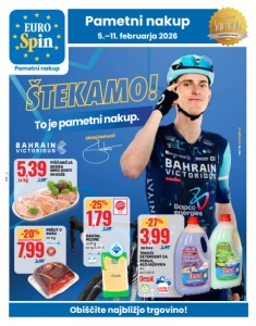 5.–11. februarja 2026 Pametni nakup Pametni nakup www.eurospin.si 1,49 1,95/ -23% TIROLSKA KLOBASA 400 g za kg 3,73 € 9,9911,99/ -16% DIMLJENA PANCETA za kg popust pri blagajni 2,252,85/ -21% MORTADELA S PISTACIJAMI 500 g za kg 4,50 € 2,793,49/ -20% PIŠČANČJE PRSI V OVITKU 400 g za kg 6,98 € glutena ojačevalcev arome soje 0,490,65/ -24% BARJENE PERUTNINSKE KLOBASE S SIROM 150 g za kg 3,27 € brez glutena 1,291,79/ -27% PREKAJEN SVINJSKI VRAT, REZINE 100 g za kg 12,90 € 1,792,29/ -21% SKUTA S 25 % M. M. 500 g za kg 3,58 € 2,693,49/ -22% SIR PROVOLONE, NAVADEN 300 g za kg 8,97 € 1 ,992,69/ -26% SURIMI V OLJU 160 g za kg 12,44 € 1,692,29/ -26% TORTELINI S PRŠUTOM 500 g za kg 3,38 € 1,491,99/ -25% MLEČNI NAPITEK Z AKTIVNIMI ENCIMI, JAGODA 6 x 100 g za kg 2,49 € z vitamini B6 in D 0,690,89/ -22% GRŠKI JOGURT Z 2 % M. M., BREZ LAKTOZE 150 g za kg 4,60 €