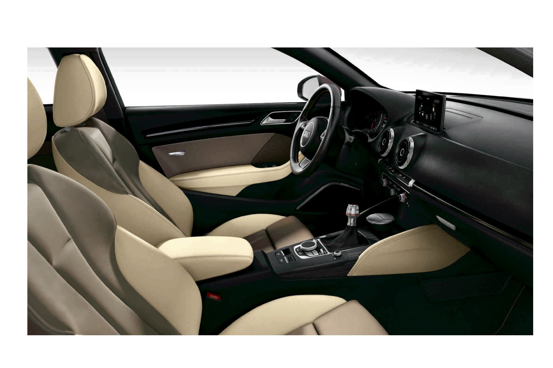 Usnjeno oblazinjenje (Paket 1) iz finega napa usnja Audi exclusive z dopolnjenim usnjenim oblazinjenjem Audi exclusive alabastrno bele/pudrno bež barve s kontrastnimi šivi pudrno bež barve ter upravljalnimi elementi Audi exclusive in
